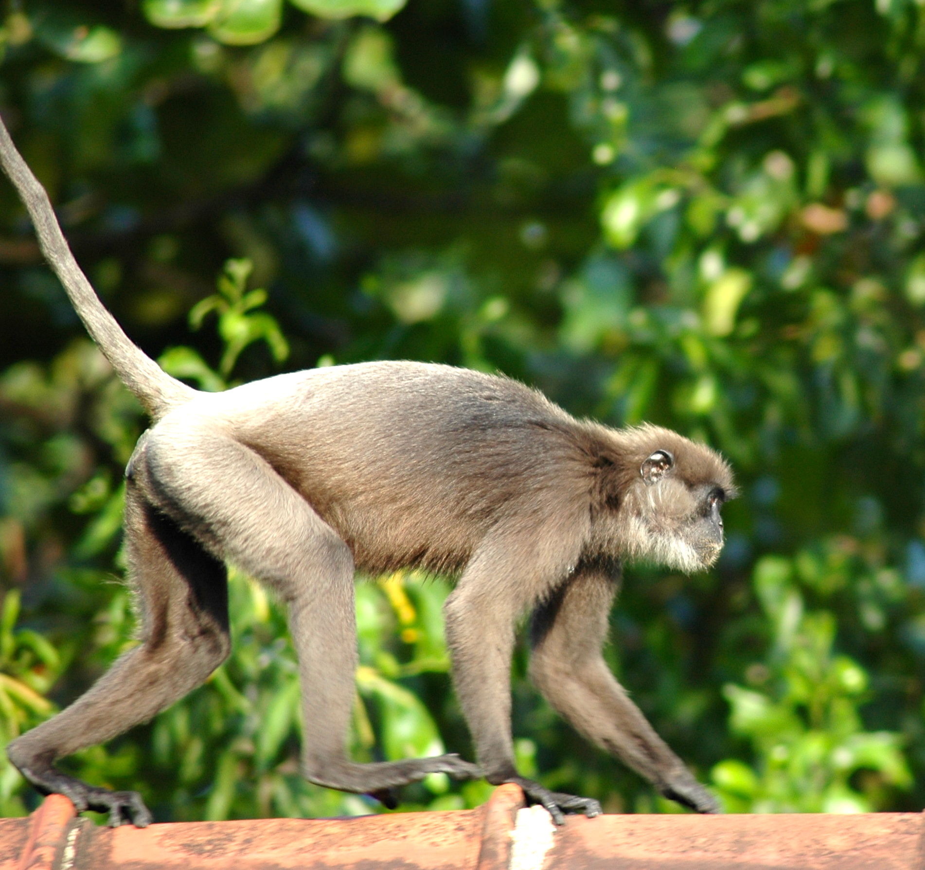 A troupe of Western Purple-faced Leaf Monkeys (Trachypithecus vetulus nestor) lived in the woods that used to surround my house in Sri Lanka. They are an endangered species endemic to Sri Lanka and continuous urbanisation resulting in loss of habitat is diminishing their numbers. They used to frolick on my roof, swing from the telephone line and drink from the bird bath in the garden. The deep throated roar of the dominant male used to wake me up in the morning. But no more – they are seldom seen now. On Friday, I was thrilled to see a troupe, with babies clinging to their mothers, on the roof of the nearby school, performing as they used to do. I managed a few photographs but they were gone as dusk fell and the Scops Owl started its melancholy song in the tall Bo tree.