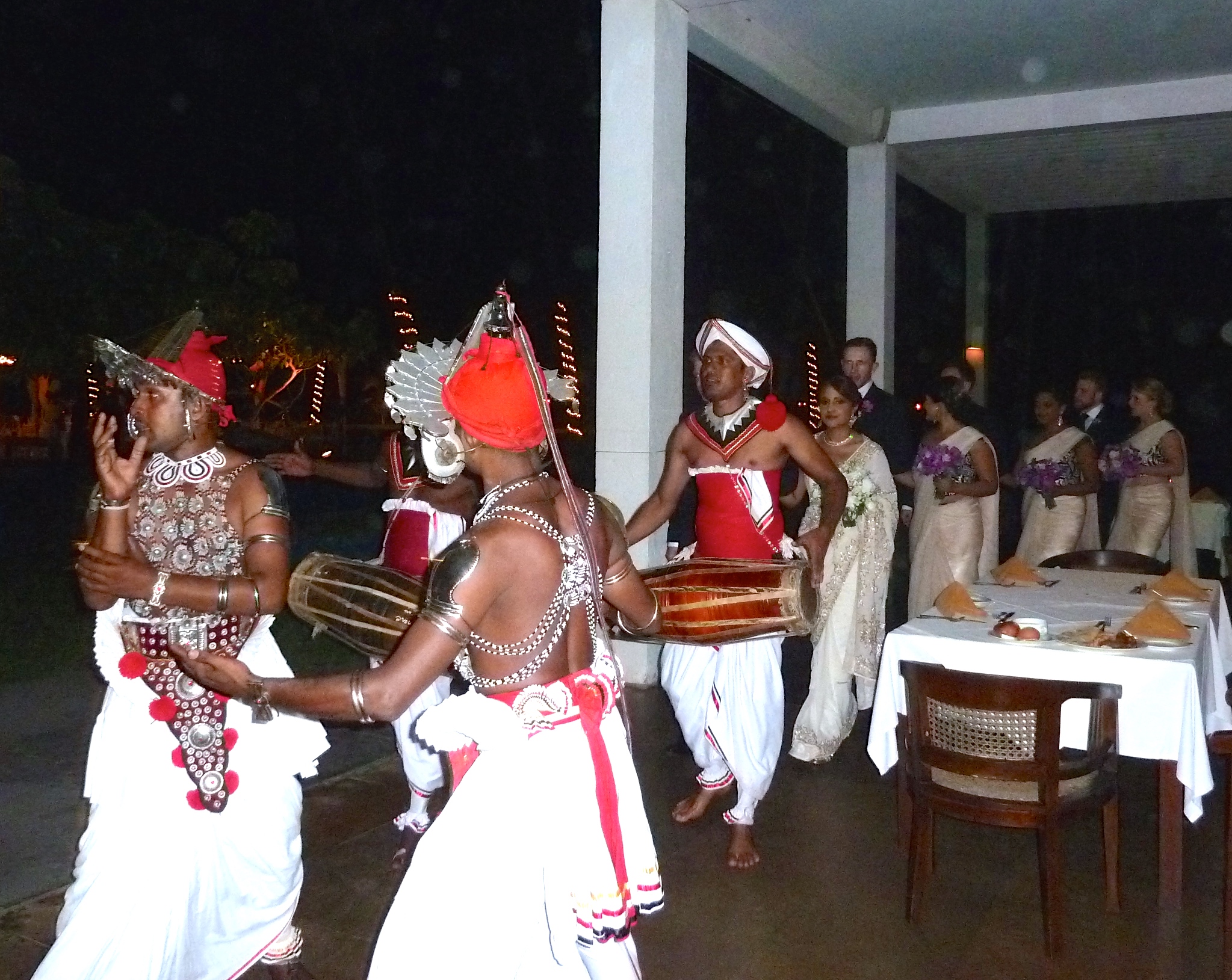 Later I sipped cold beer on the verandah and watched a young couple being led by Kandyan dancers to a decorated and lit up marquis in the garden for their wedding reception. Women wore colourful and glistening sarees and men sweated in dark suits. Dilmah, a local tea firm, was celebrating Valentins’s Day in another part of the garden.