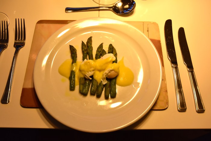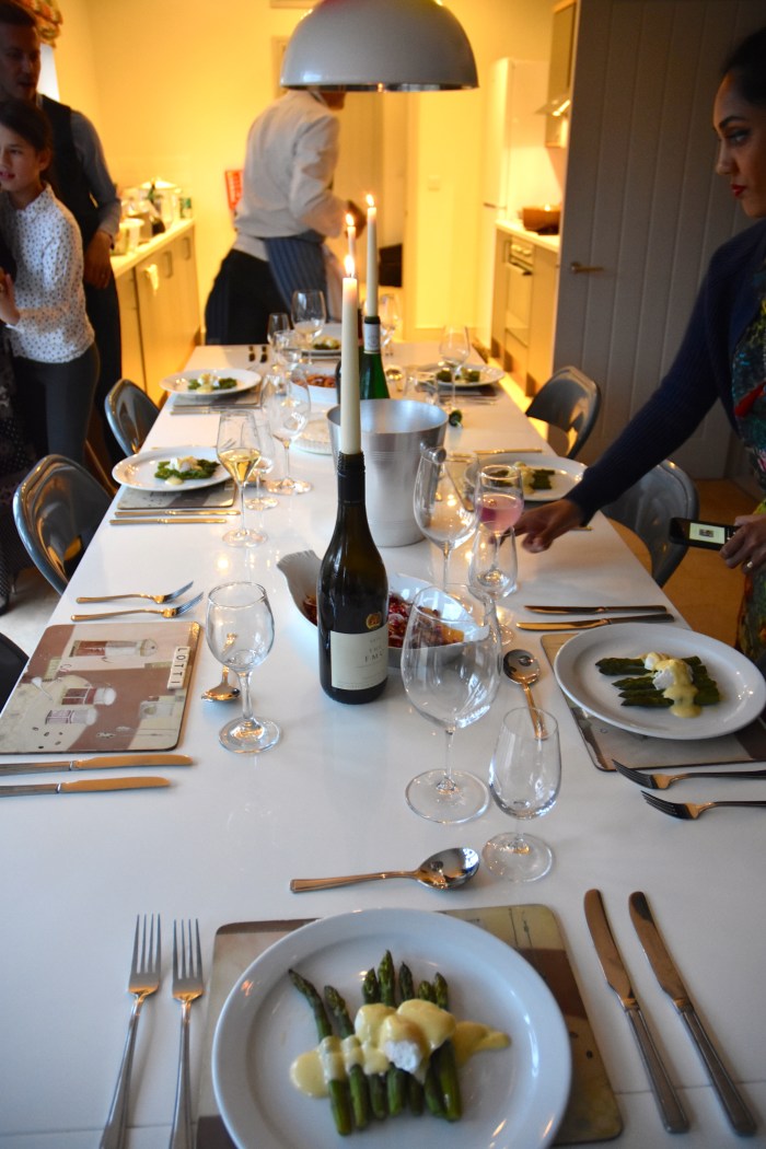 Table for dinner was laid in the next room and Hasan served a seasonal starter of asparagus, quails eggs and hollandaise sauce. We drank Josmeyer’s Alsace Grand Cru Hengst 2007 with it.