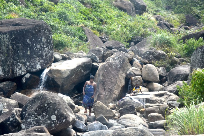 At Rangala, a narrow road full of potholes climbs up the mountain through patches of forest and tea plantations where women pluck leaves while supervisors watch from the road. A woman baths in a rocky stream and a bored little boy looks on. Woodsmoke rises from terraced paddy fields that dot the valleys. The air is cool and fresh and invigorating.