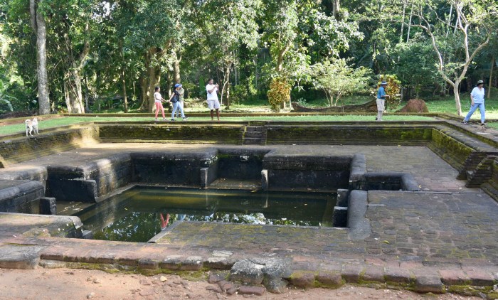 The pond is supposed to be part of a palace complex but no trace of it remains. The bathing pond has the base of what appears to be a changing or rest room and an elaborately carved squatting toilet stone.