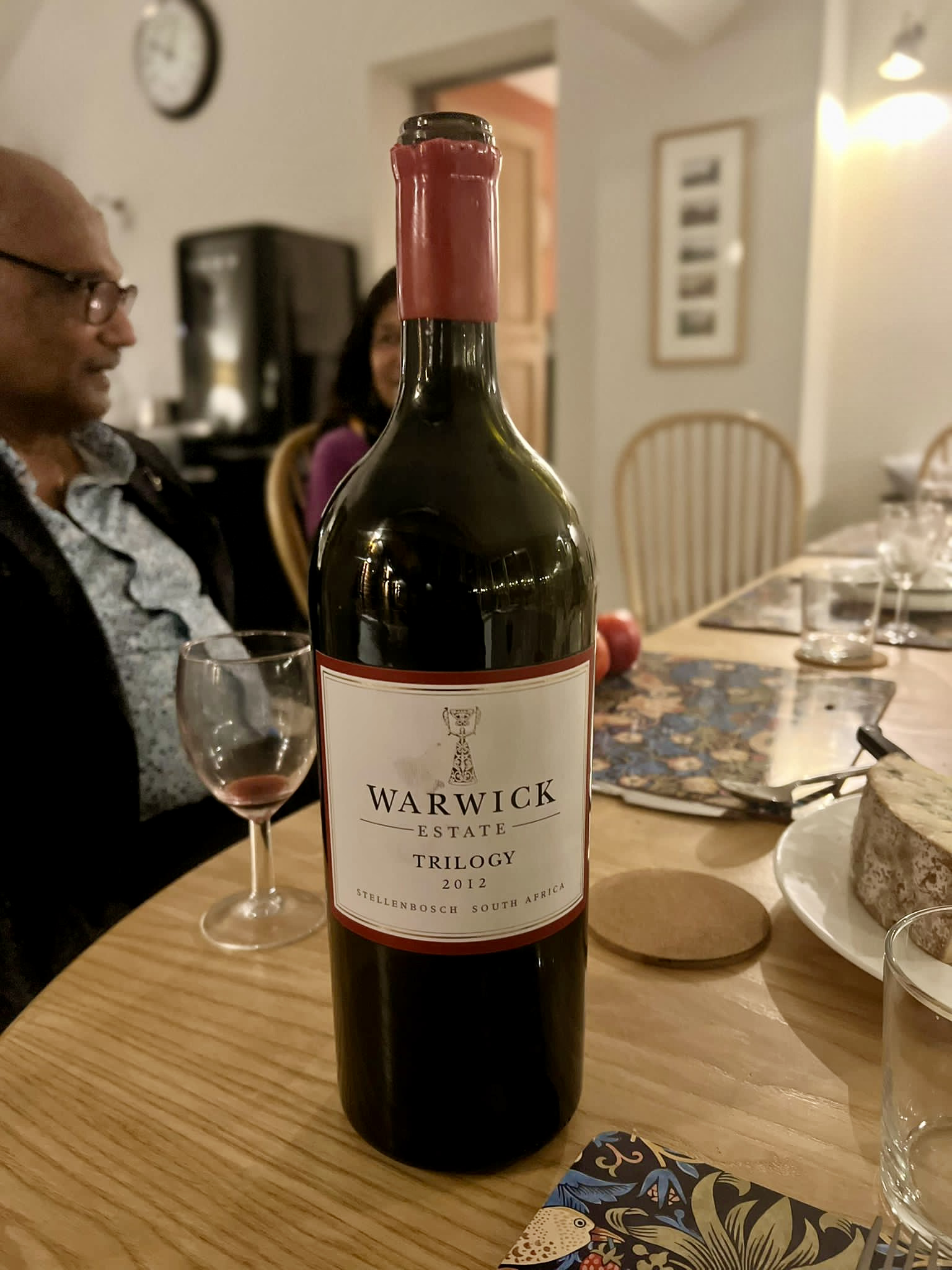 Tenuta Regaleali Vigna San Francesco 2016, Warwick Estate Trilogy 2012 en magnum and Moss Wood Cabernet Sauvignon 2012 were poured with dinner. Graham’s 30 Year Old Tawny Port was sipped with the Cropwell-Bishop Stilton.