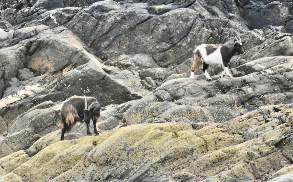 Dolphins made a brief appearance and some of the 500 odd wild goats of Jura with shaggy coats and curved swept-back horns were seen grazing on sea weeds near the shore.