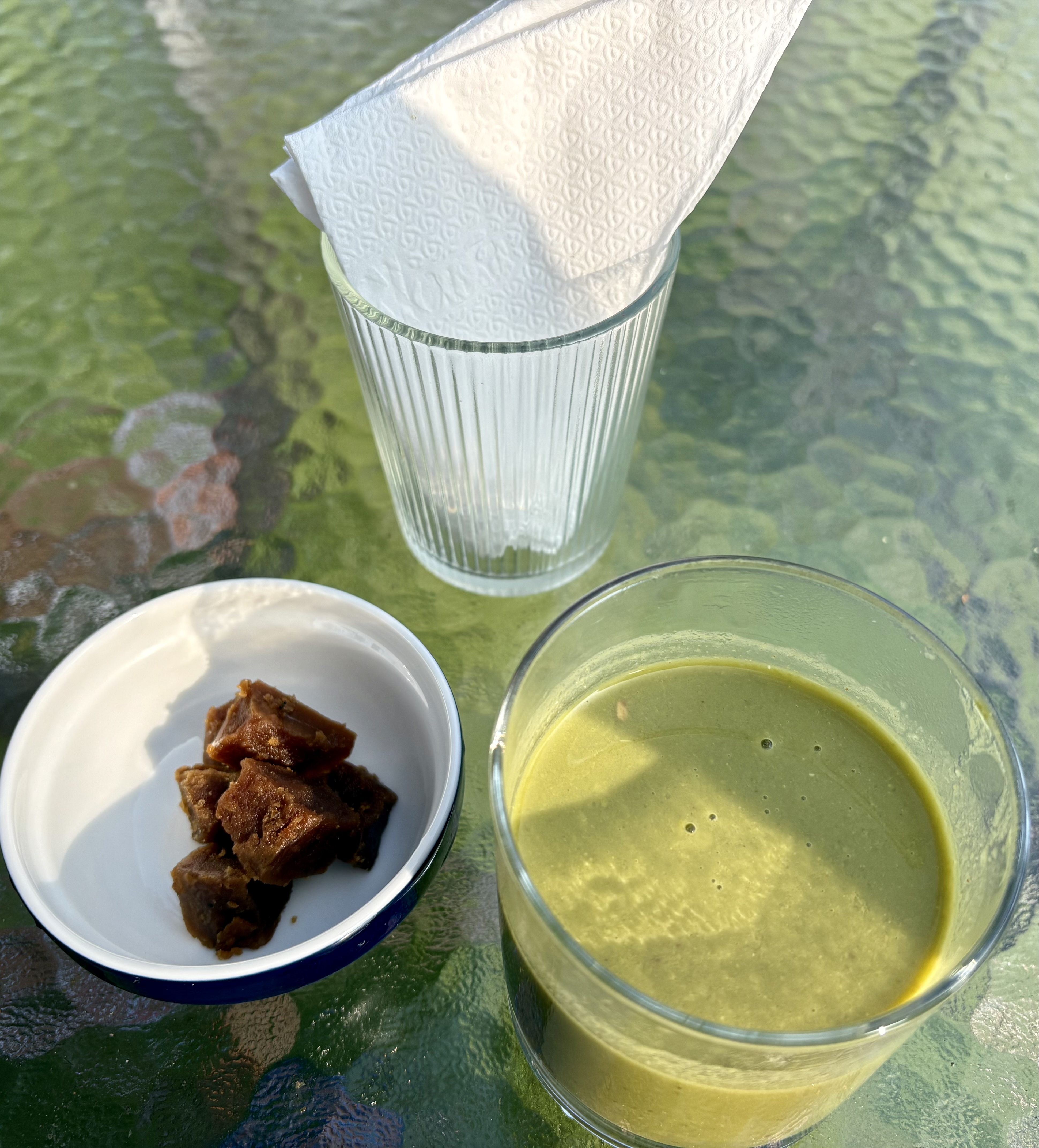 Kola kanda is a traditional herbal congee or gruel made from raw rice, coconut milk and the fresh juice of medicinally valued leafy greens. The leaves may include gotukola, karapincha (curry leaves), welpenela, iramusu, hatawariya, polpala, or ranawara. It is usually served at breakfast, steaming hot, with a piece of jaggery (palm sugar) to counter the bitterness of the herbal leaves.